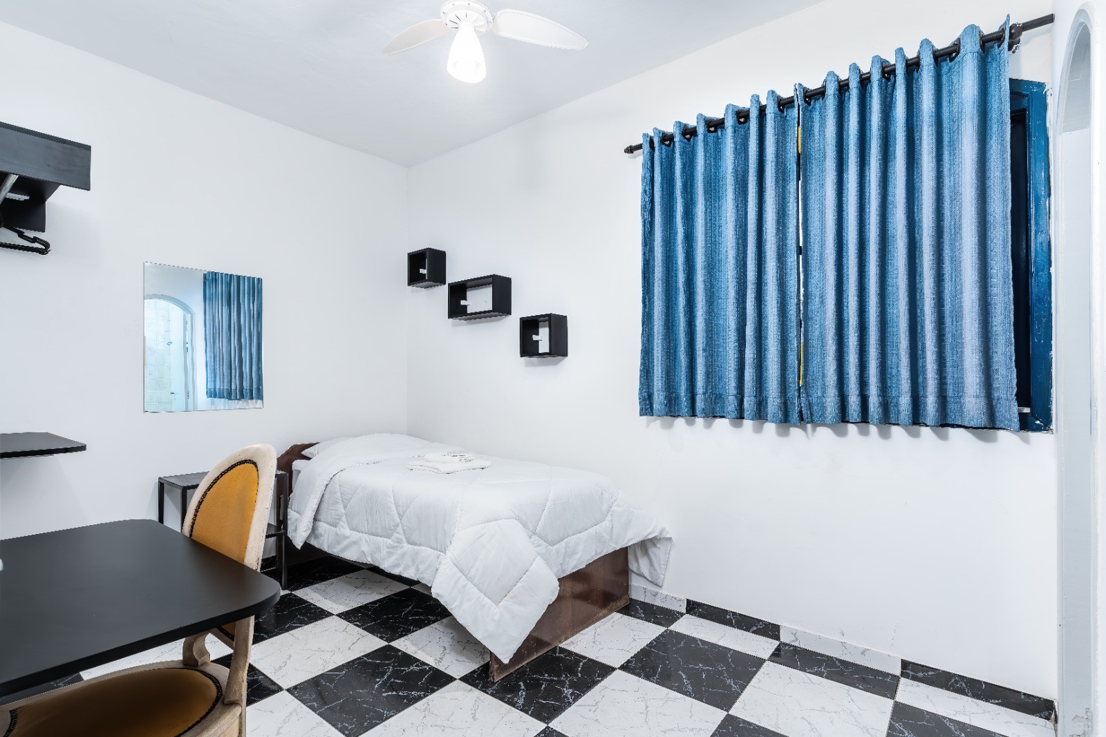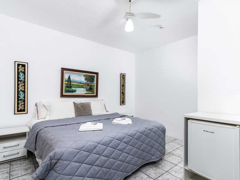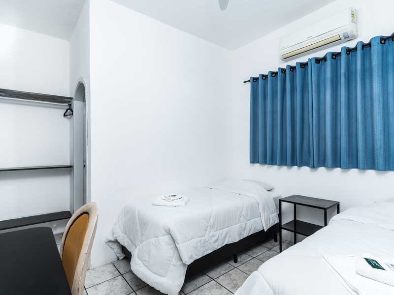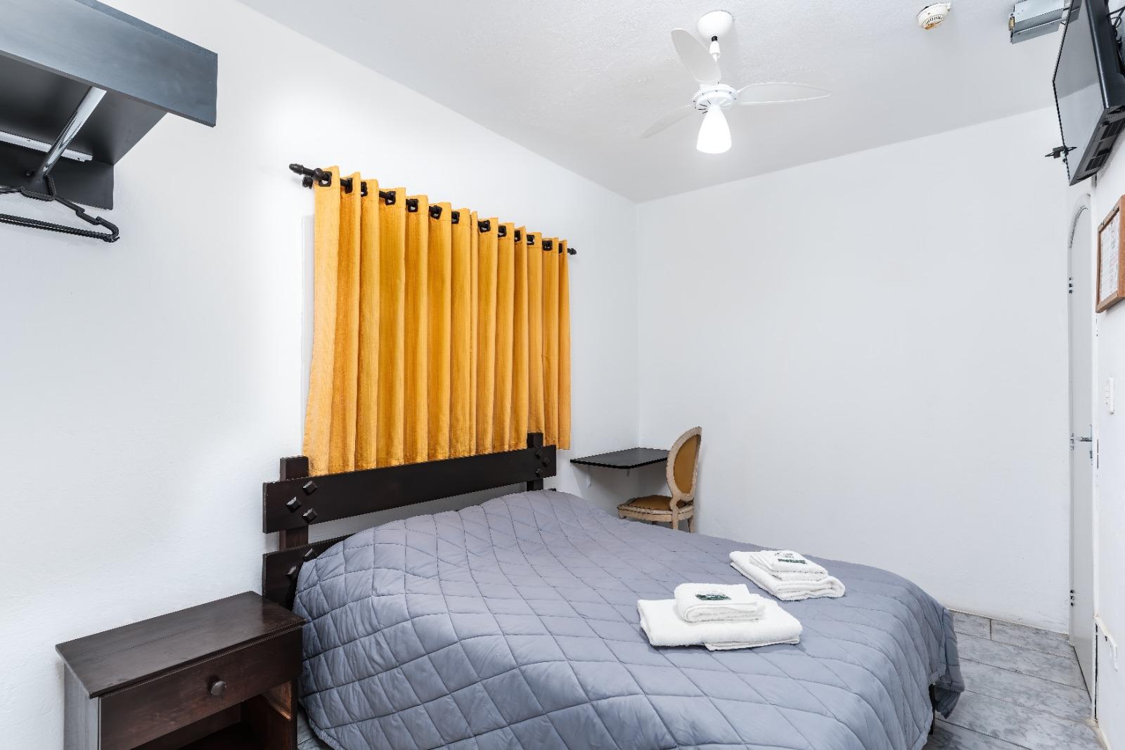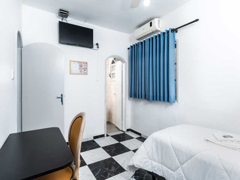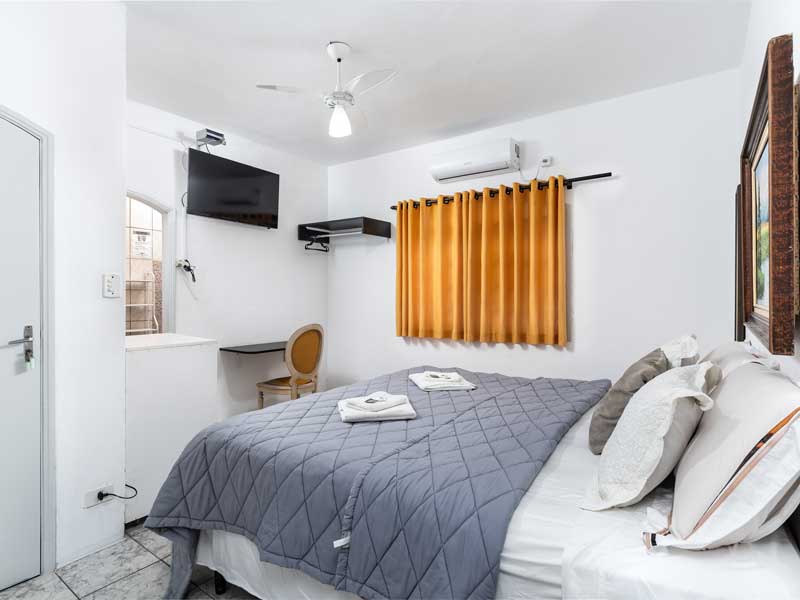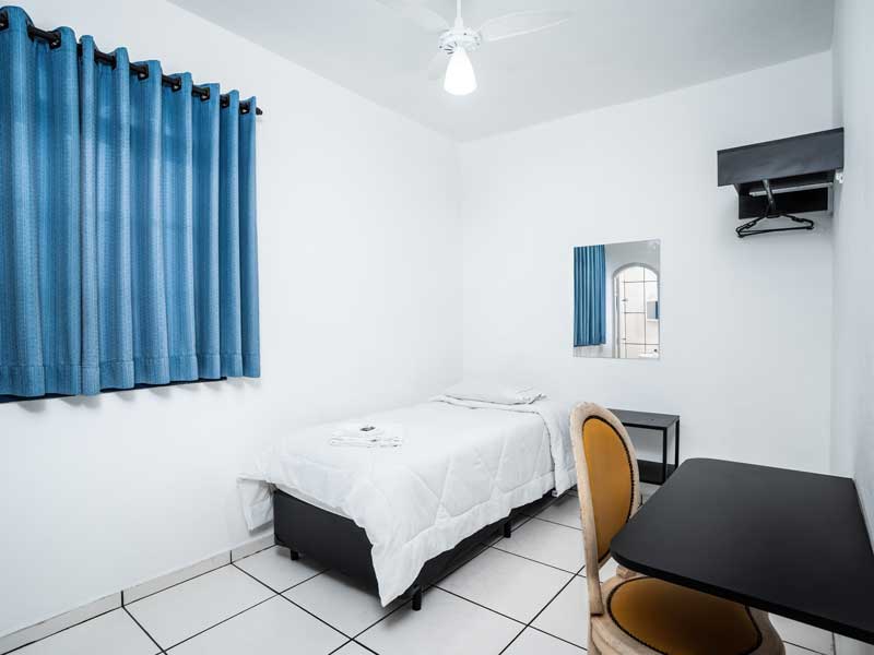 Ideal para quem viaja sozinho ou com um acompanhante, o Quarto Simples é aconchegante e oferece todo o conforto necessário para uma boa estadia. Equipado com as comodidades padrão de nossa pousada, como TV Smart, canais a cabo, banheiro privativo, Wi-Fi, mesa de home office e cama box. Quartos e preços exclusivos com ou sem ar sendo para uma ou até duas pessoas.