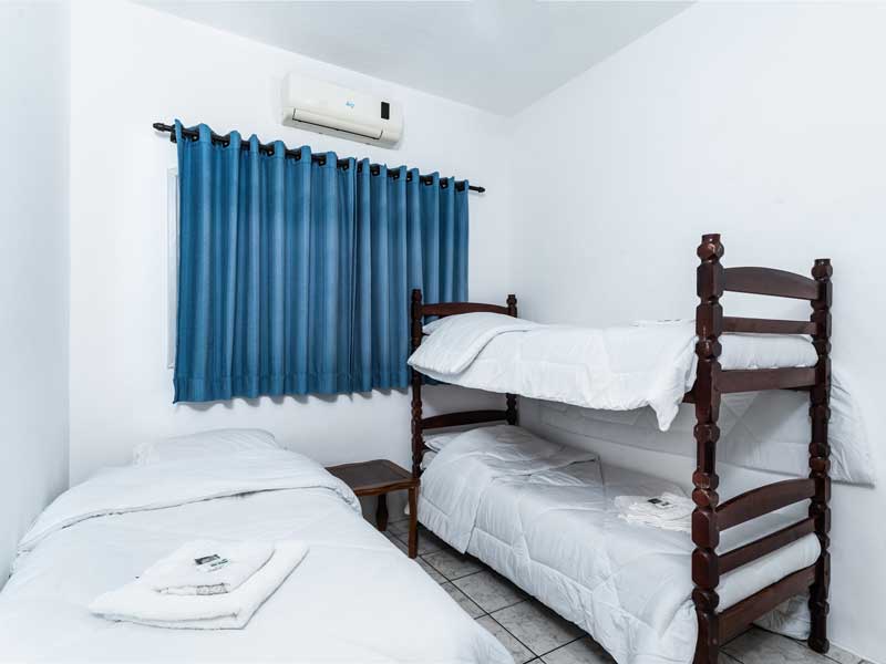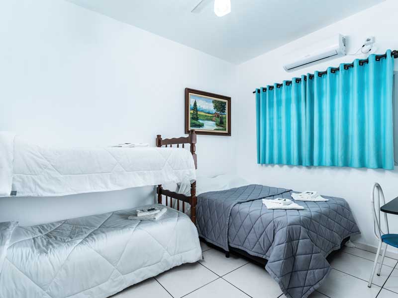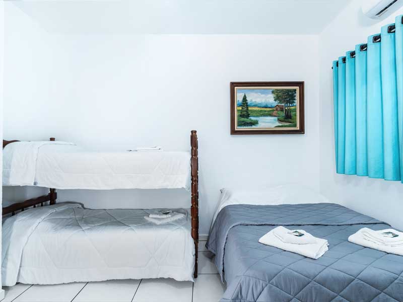 Ideal para famílias maiores ou grupos, o Quarto Quádruplo oferece um ambiente espaçoso e confortável, com capacidade para até quatro pessoas. Este quarto também vem com as comodidades padrão, como TV Smart, canais a cabo, banheiro privativo, Wi-Fi, mesa de home office e camas box, sendo uma box de cama de casal com uma beliche.